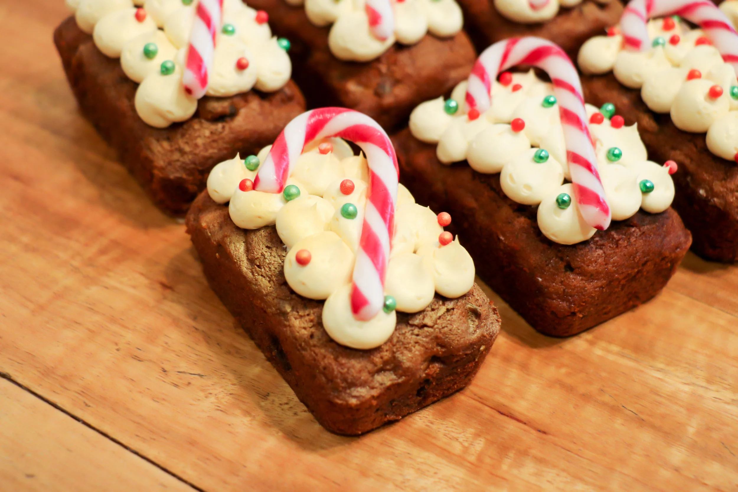 To finish, fill piping bag w rum frosting & pipe top surface of tea cakes (I like doing a tear drops styled dollop). Decorate with edible jewels & baubles! For festive cakes, I love using fresh herbs to really bring out the amazing aromas of the cake as well.
