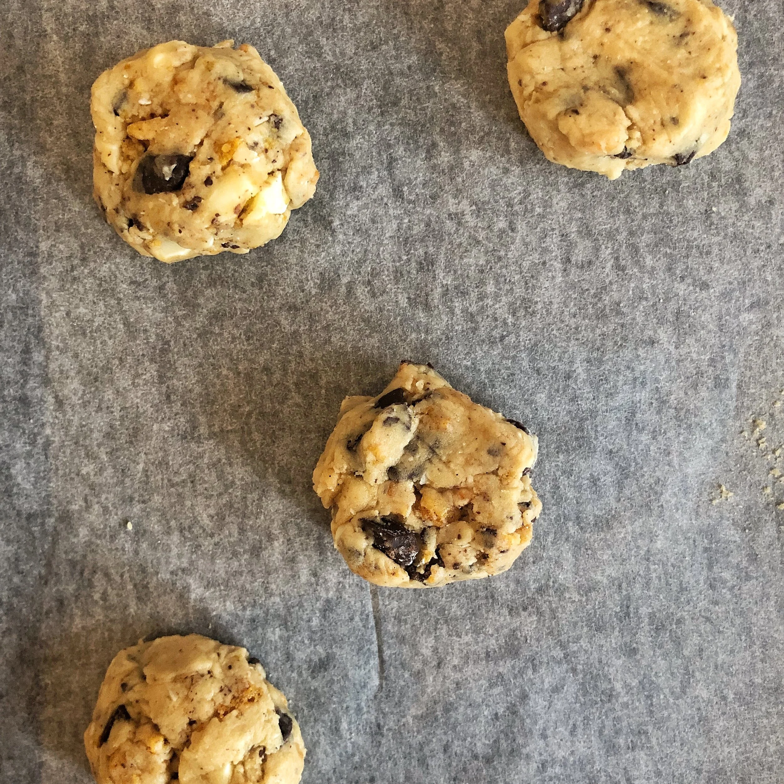 Add flour, baking soda & salt before mixing until just combined. Add both chocolates and honeycomb into dough mix, making sure it’s evenly combined. Roll out balls of dough around 25-27g and flatten slightly (pictured). Place trays in the fridge for at least 20 minutes to allow dough to rest, before baking for 12 minutes (or until honeycomb is bubbly & cookie is a light golden colour).