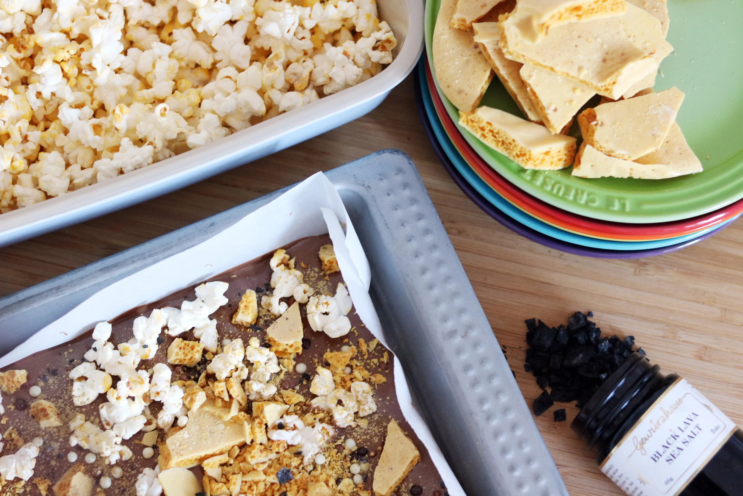 Serving suggestion! Line a baking tray w greaseproof paper. Melt some chocolate of your choice (I chose milk chocolate) and and spread even on to greaseproof paper. Sprinkle honeycomb, chocolate crispy pearls (I get mine from The Essential Ingredient), popcorn (& whatever other tasty morsels you have in the hand in the pantry)! I added a little bit of Gewurzhaus' black lava salt to balance out the sweetness of the chocolate & honeycomb. Allow chocolate to set before breaking/cutting up into serving pieces.