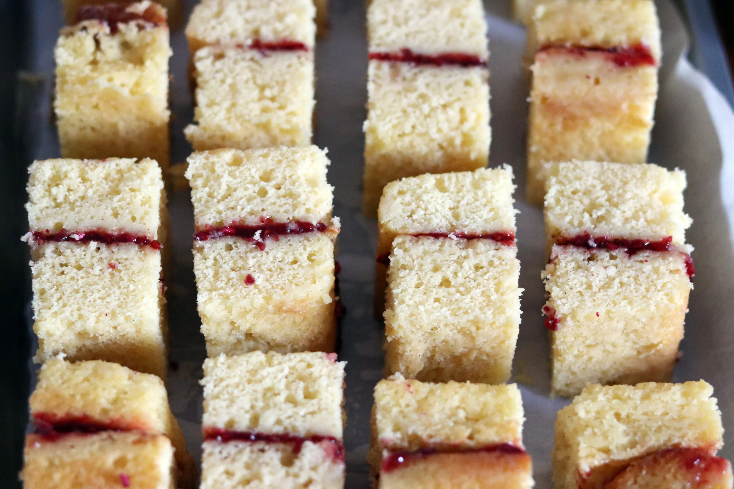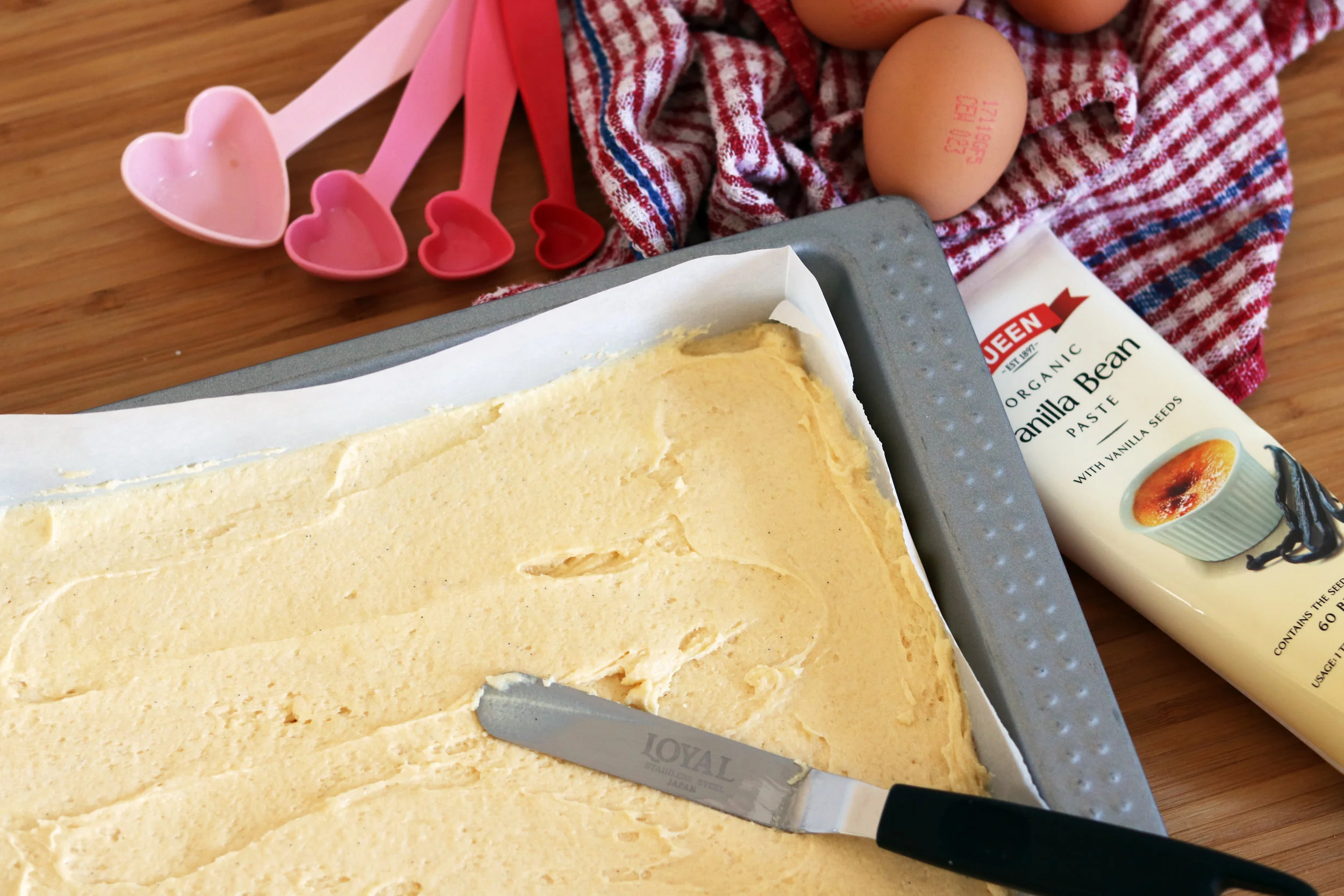 To make sponge cake, preheat oven to 175 degC, grease & line two 8 x 12 inch tins. Cream butter & sugar together, until light and fluffy (it will look a very pale yellow). Slowly add eggs & combine (mixture might split but continue on)! Gently fold in flour, milk & vanilla bean paste before pouring batter equally into the two pans & bake for 15-20minutes (or until fully cooked, you can use a skewer to check). Allow to cool completely.