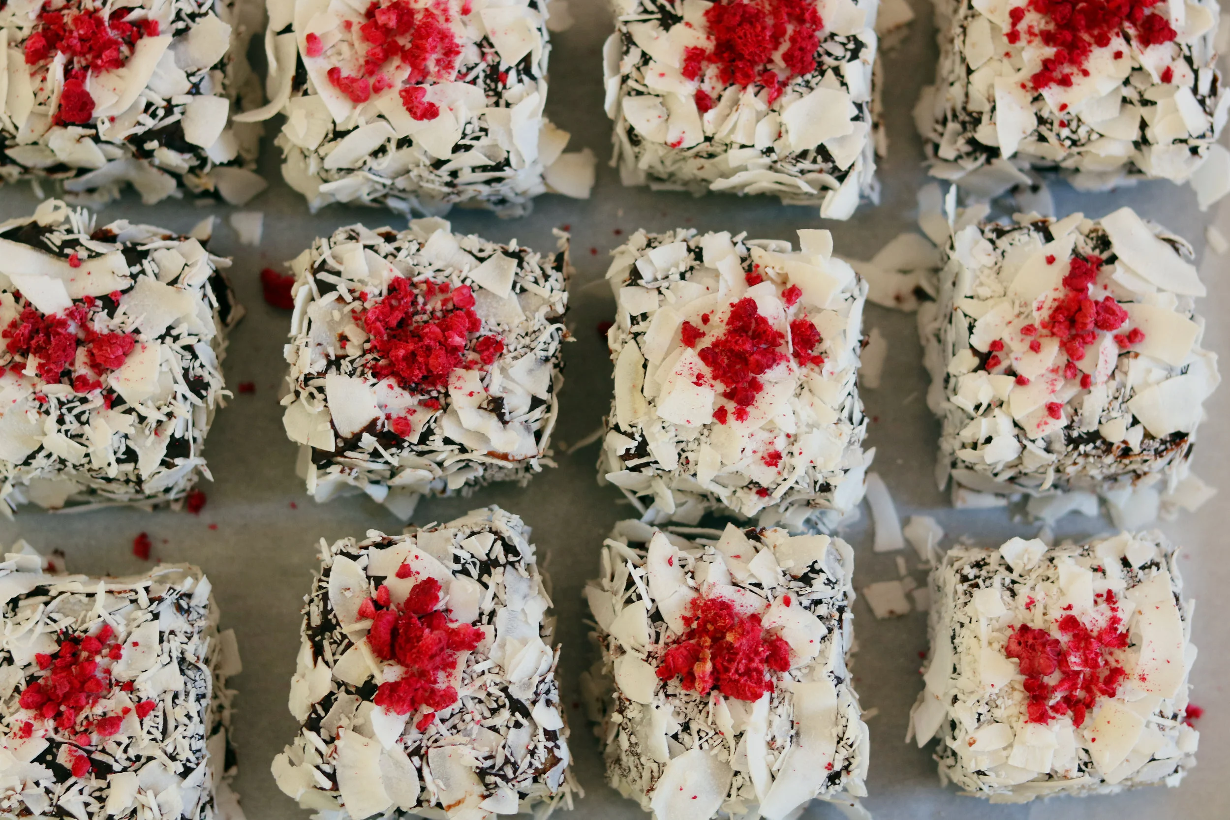 Spread half the coconut on a tray. Using tongs, thinly coat the lamington in the chocolate ganache & allow them to drip excess on a cooling rack. Place lamington in coconut tray, and using your hands, lightly dust the sides with flaked coconut. Refrigerate until firm (at least an hour), just before serving sprinkle some extra freeze dried berries on top.