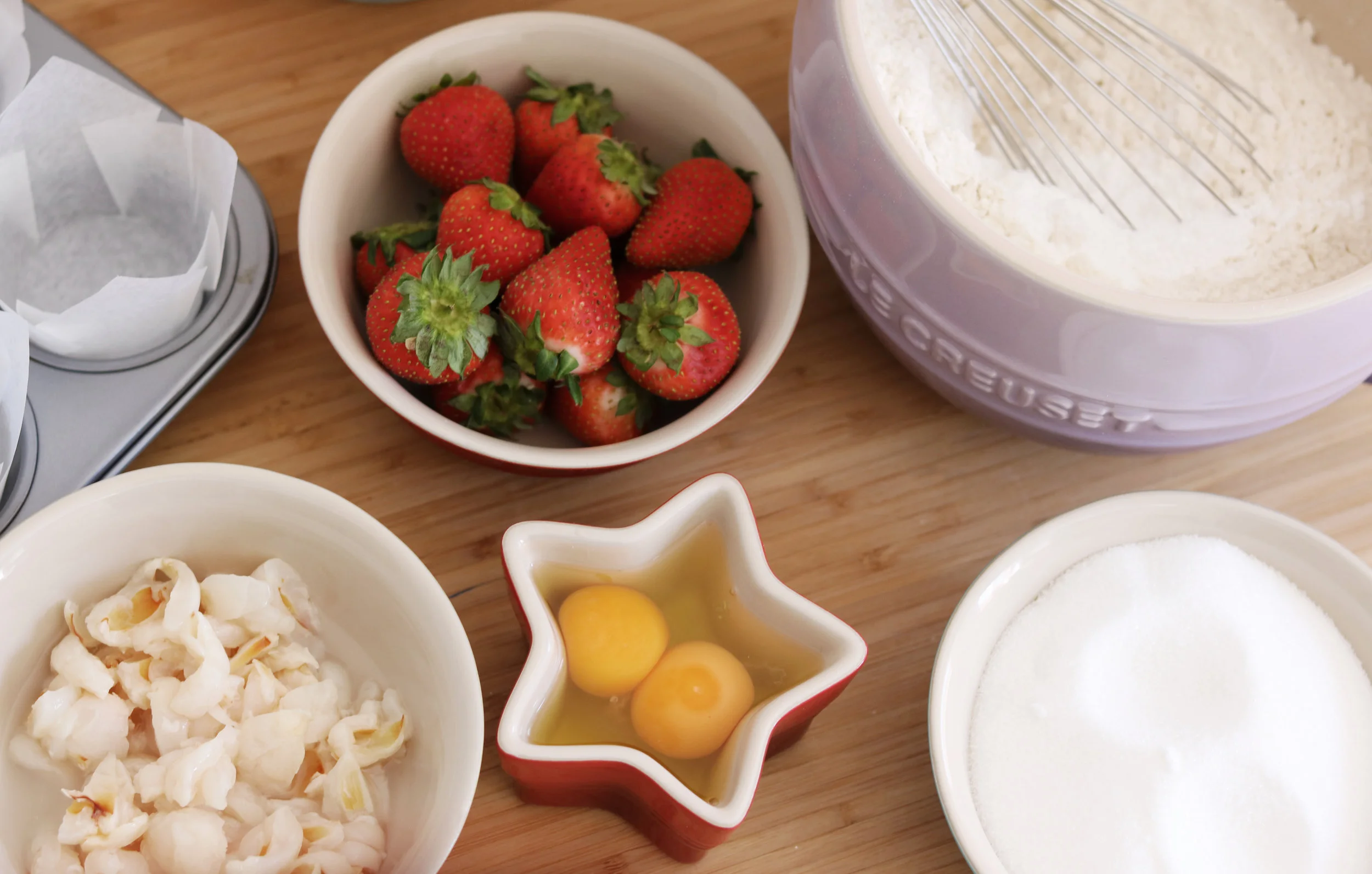 Pour the wet ingredients into the dry, mix until just combined. Lightly fold in strawberries & lychees. Carefully fill muffin tray & bake for 35 minutes, or until a skewer comes out clean when inserted into the centre of muffin.