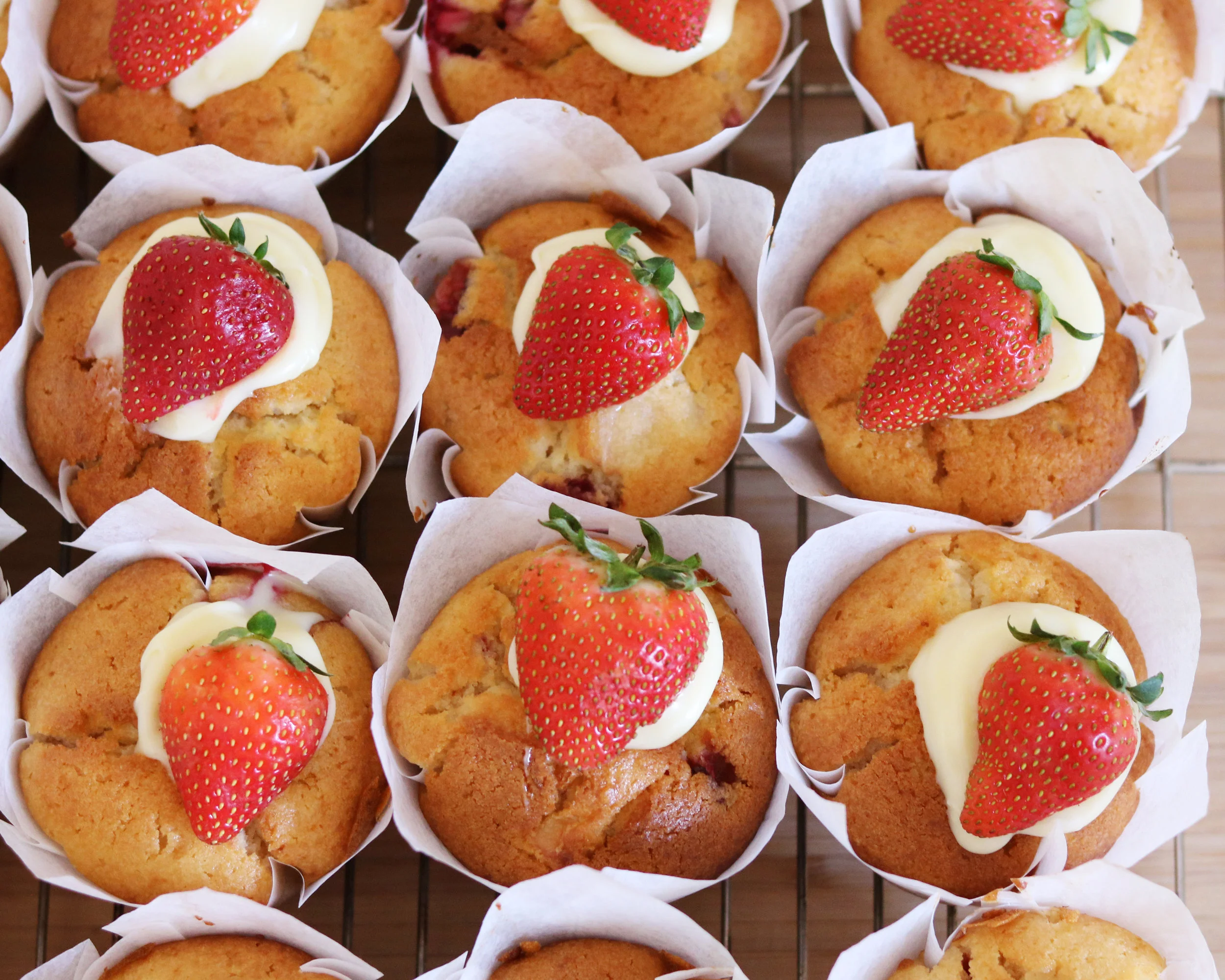Quite a number of old customers voiced how much they missed these muffins so I thought I would also post the recipe for them to try! I’ve shrunk the recipe from the epic cafe proportions for at home enjoyment! You can substitute the strawberries & lychee for any other fruit or filling you feel like; by replacing w around 180-220g of your choice.